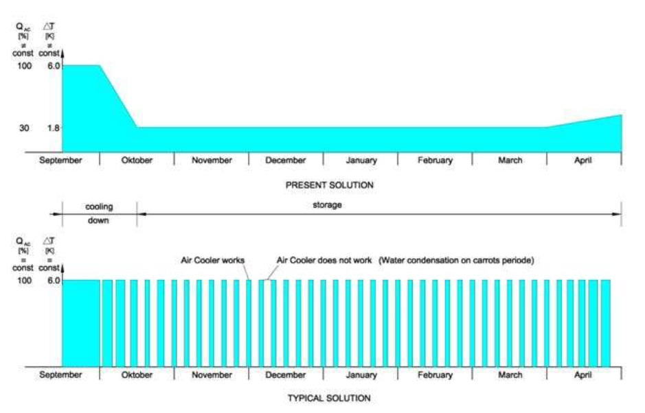 The main requirement for cold storage of carrots is to have the necessary cooling capacity that ensures quick cooling of the daily load of fresh carrots supplied from a field. Quick cooling of harvested carrots reduces the intensity of respiration process, and the development and spread of all pathogens. The cooling system should guarantee the same temperature and high humidity of stored carrots in the entire volume of the storage chamber. Humidity should be kept near saturation point but without condensation of moisture on the stored carrots. The moisture condensing on the carrots is the cause of their decay. All of these technological requirements should be implemented simultaneously with the other technical requirements for modern refrigeration systems.