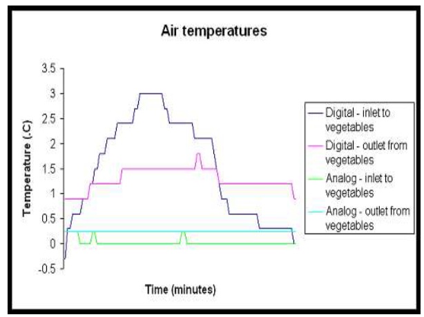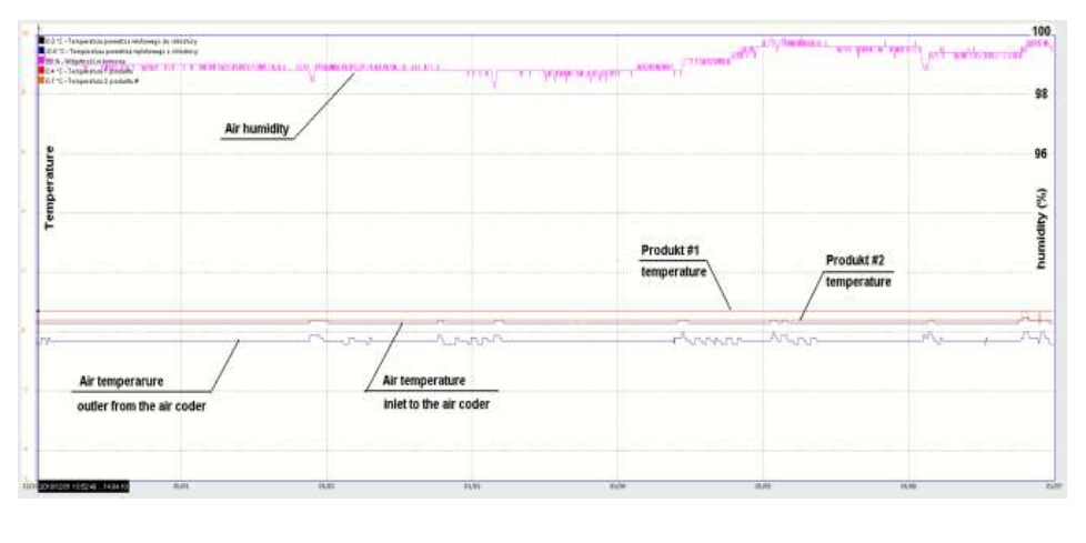 Figure 7. Graphs of air temperatures, humidity of air and carrots temperatures in time.