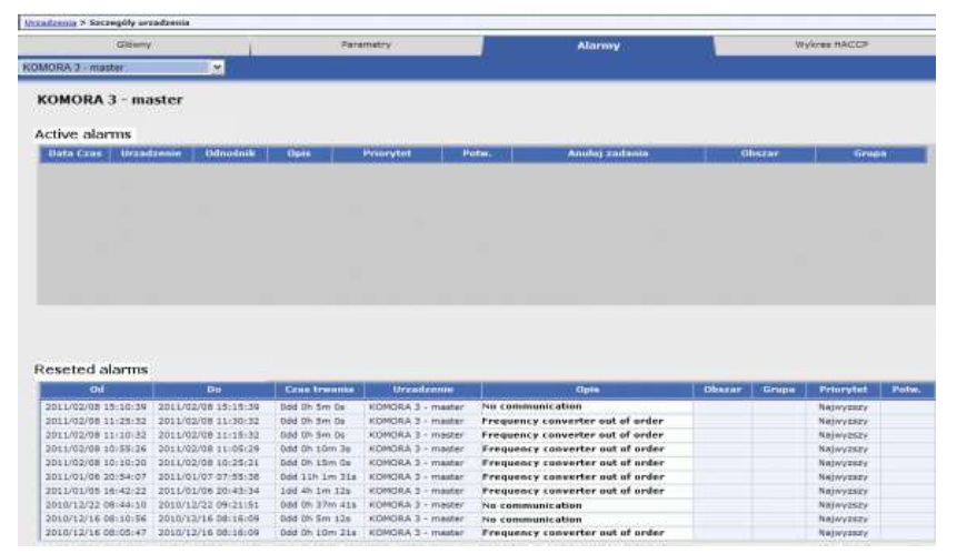 Figure 8. View on the exemplary alarms information provided by the control system.