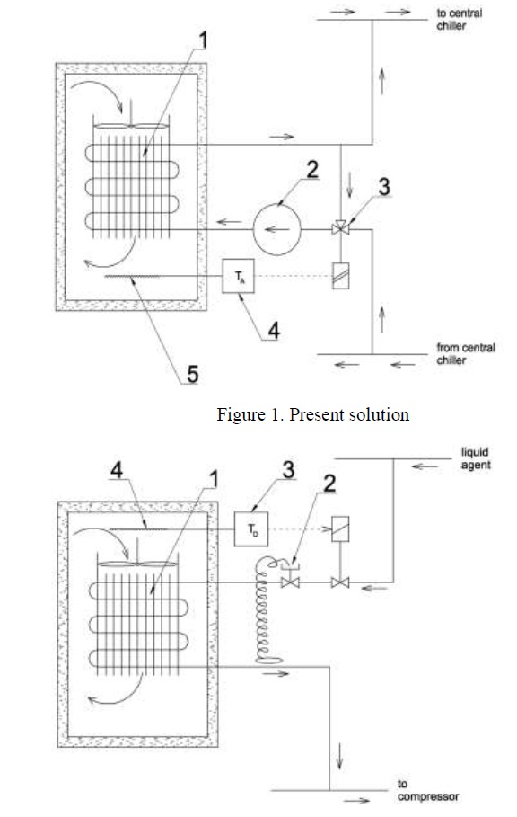 The solution presented in Figure 2 consists of a lamella air cooler with fan (1), expansion valve (2) and a conventional thermostat (3) (ON / OFF) with the sensor (4) positioned in the air flowing into the air cooler.