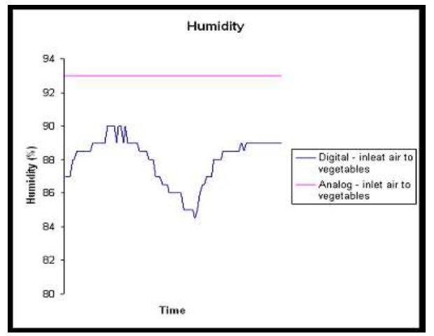 The use of the air cooler with adjustable capacity allows to work with very little temperature difference in temperatures between air temperature in the cold chamber and the coolant. This assures very high humidity level in the cold storage chamber. Direct expansion systems are often designed for quick cooling during loading of fresh carrots. In the winter they work 20 – 30% of the time only. In spite of the investment costs the remaining time (70-80% time) they do not work. Comparison of the stability of air temperatures at the inlet and outlet of air coolers for the presented and typical systems is presented in Figure 3 and comparison of humidity is shown in Figure 4. The problem of condensation of moisture on stored carrots is very important because of the accompanying decay and the associated qualitative and quantitative losses in stored carrots. In traditional systems the air cooler is the coldest element in the chamber. When the air temperature set up by the thermostat is achieved the air cooler is off. Then carrots became the coldest element in the chamber. This way the moisture will be condensed on carrots. Therefore, the source of these problems is not high level of humidity but the cyclic operation of the air cooler. Comparison of work air cooler during storage season in present and typical solution is presented in Figure 5. In solution with the adjustable capacity of the air cooler such phenomena do not occur. This new solution increases the work rate of the installed air coolers, improves temperature stability throughout the chamber and increases the relative humidity in the chamber as well as prevents the condensation process of moisture on the stored carrots. Apart from technological advantages of having the impact on the quality of carrots after the storage, this new system fulfils the technical demands and environmental challenges for modern refrigeration systems. The described system reduces the amount of refrigerant charge (R 404A) since refrigerant is charged only in the chiller. The chiller has been produced in special workshop with guarantee of high quality and reliability. The use of heat recovery from superheated vapour of R 404A allows defrosting of the air coolers. This solution simplifies electrical installation (no dedicated heaters, electrical cables, electrical cabinets, etc.) and saves energy. In contrast with coolant piping, the refrigerant piping works at high pressure and should guarantee proper oil circulation. Refrigerant pipeline should be designed, constructed and maintained by experienced contractors. In carrots cold storage the coolant pipelines transporting glycol to the air coolers are made of plastics. The implementation process is much simpler (bonding) and easier than in the case of metal pipeline. Also, there is no problem of socalled oil traps associated with the transport of oil at long distances in refrigeration systems. However,